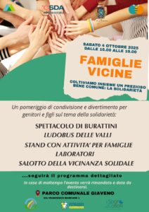 Le famiglie potranno trovare: il Ludobus delle valli, uno spettacolo di teatro di burattini, svariati laboratori inclusivi, giochi da tavolo, associazioni sportive del bando Opportunità, una merenda offerta, divertimento e tanto altro.
